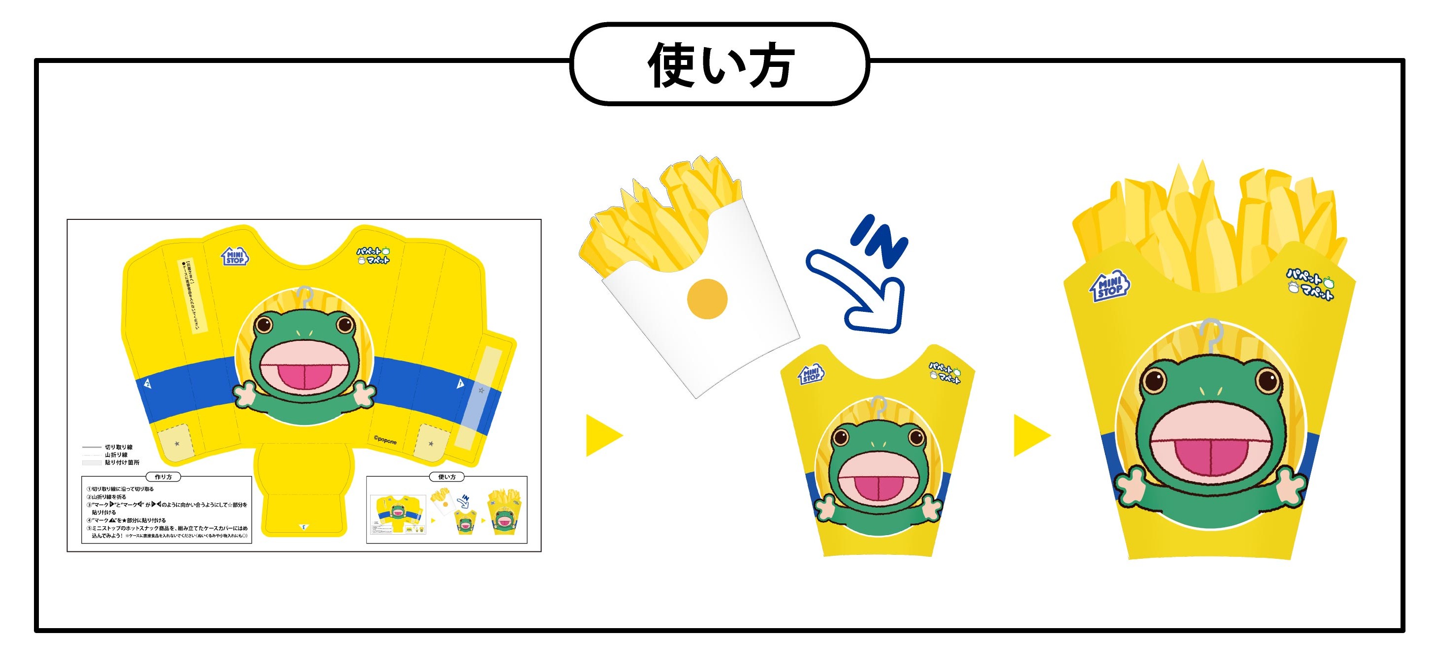 ※お客様ご自身でカット&組み立てていただき、 ミニストップ店頭のホットスナック商品をはめて使用する ケースカバーとなります。(作り方は用紙をご参照ください。) ※ケースに直接食品を入れないでください。 ※一部サイズ対応外ホットスナック商品もございますので あらかじめご了承ください。 ※小物入れやぬいぐるみケースとしてもご利用いただけます。